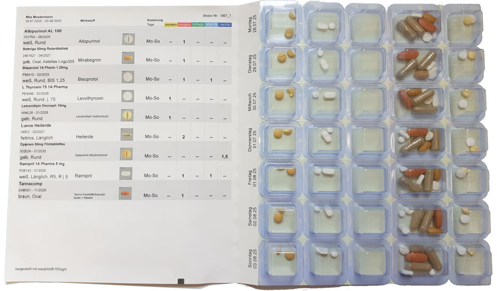 Die tägliche Medikamenteneinnahme kann zur Herausforderung werden – vor allem, wenn mehrere Arzneimittel zu verschiedenen Zeiten eingenommen werden müssen. Wir bieten Ihnen eine professionelle Lösung: die Verblisterung Ihrer Medikamente in wochenweise vorbereitete Blisterpackungen – individuell abgestimmt und absolut zuverlässig.